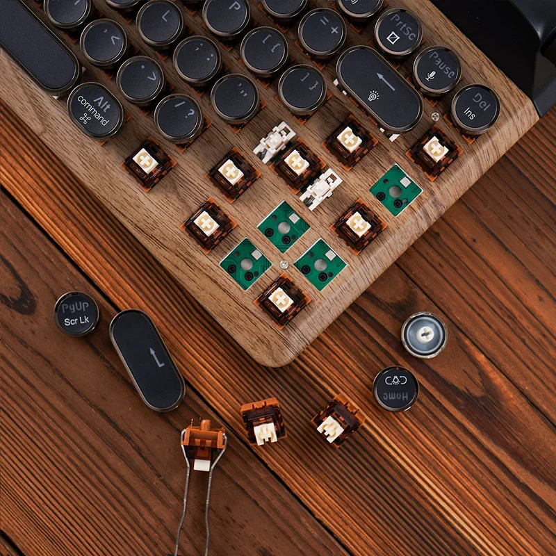 We refused to use cheap, hollow plastic. The keyboard's surface panel (Top Plate) is crafted from a durable aluminum alloy, expertly finished with an artisanal wood-grain texture that exudes warmth and class. The internal construction is weighted for rock-solid stability on your desk. It’s heavy, it’s premium, and it strikes the perfect balance between industrial durability and vintage elegance.